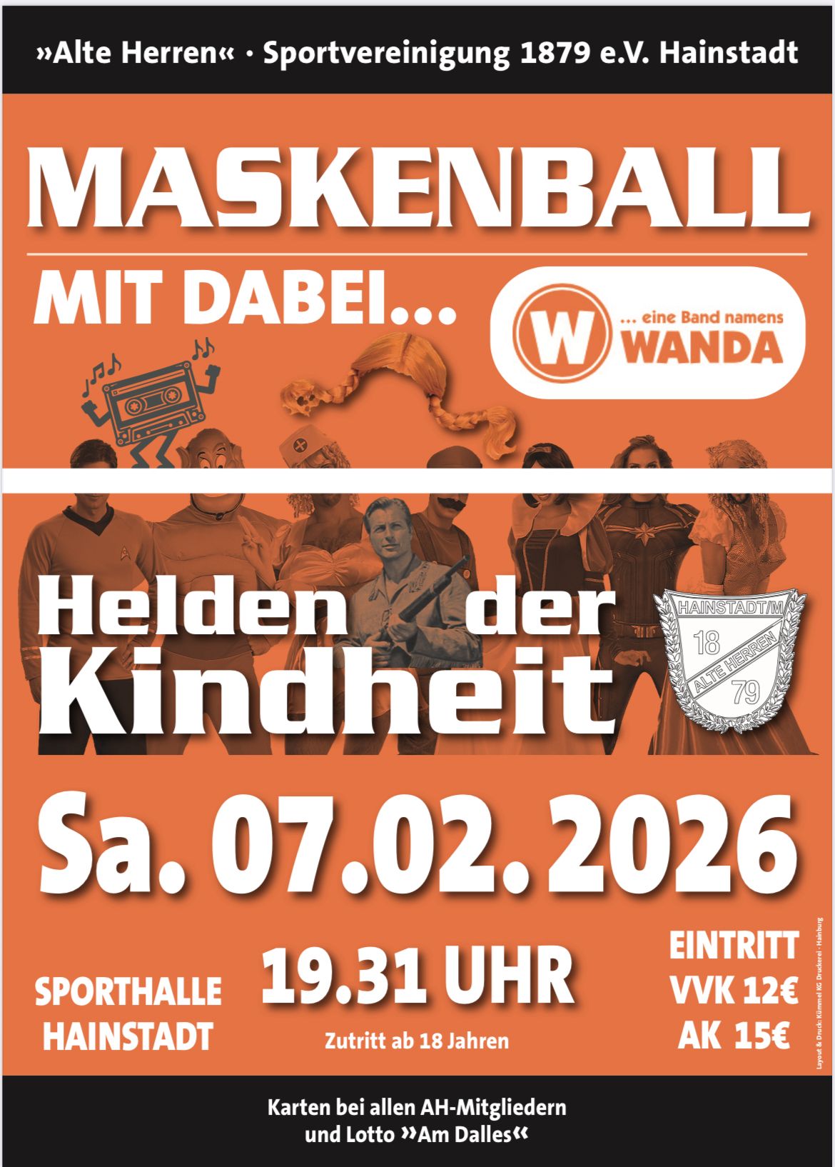 Die „Alten Herren“ der Sportvereinigung 1879 e.V. Hainstadt laden am Samstag, 07. Februar 2026, zum traditionellen Maskenball in die Sporthalle Hainstadt ein.